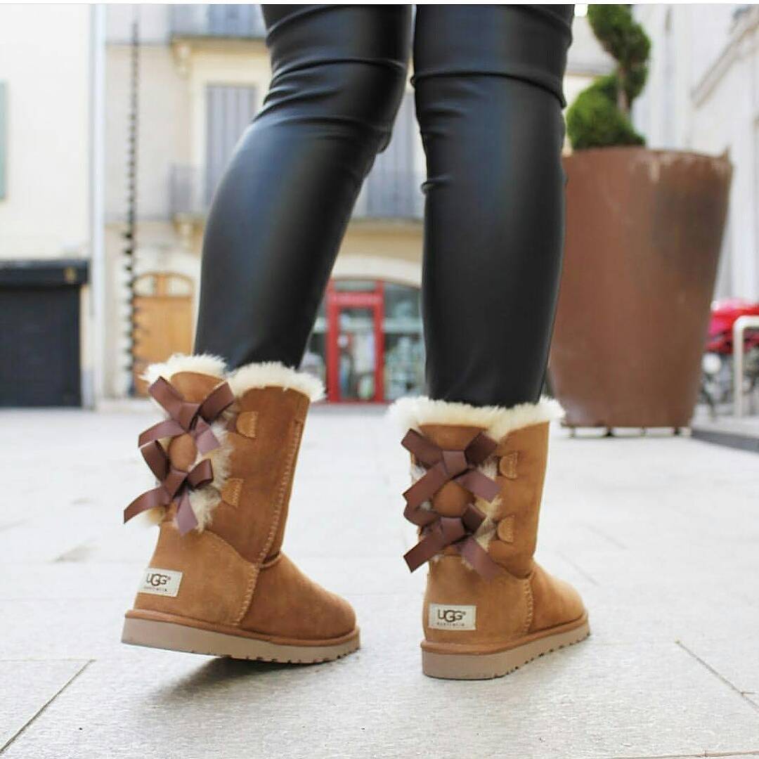 На вопрос, какая обувь самая теплая и максимально комфортная для осенне-зимнего периода, ответ один. Это разработанные мировыми дизайнерами UGG Bailey Bow, которые представляют собой сапоги с округлым носком и дополнительным декором на задней стороне голенища в виде широких лент. Такое украшение делает модель более привлекательной и женственной.